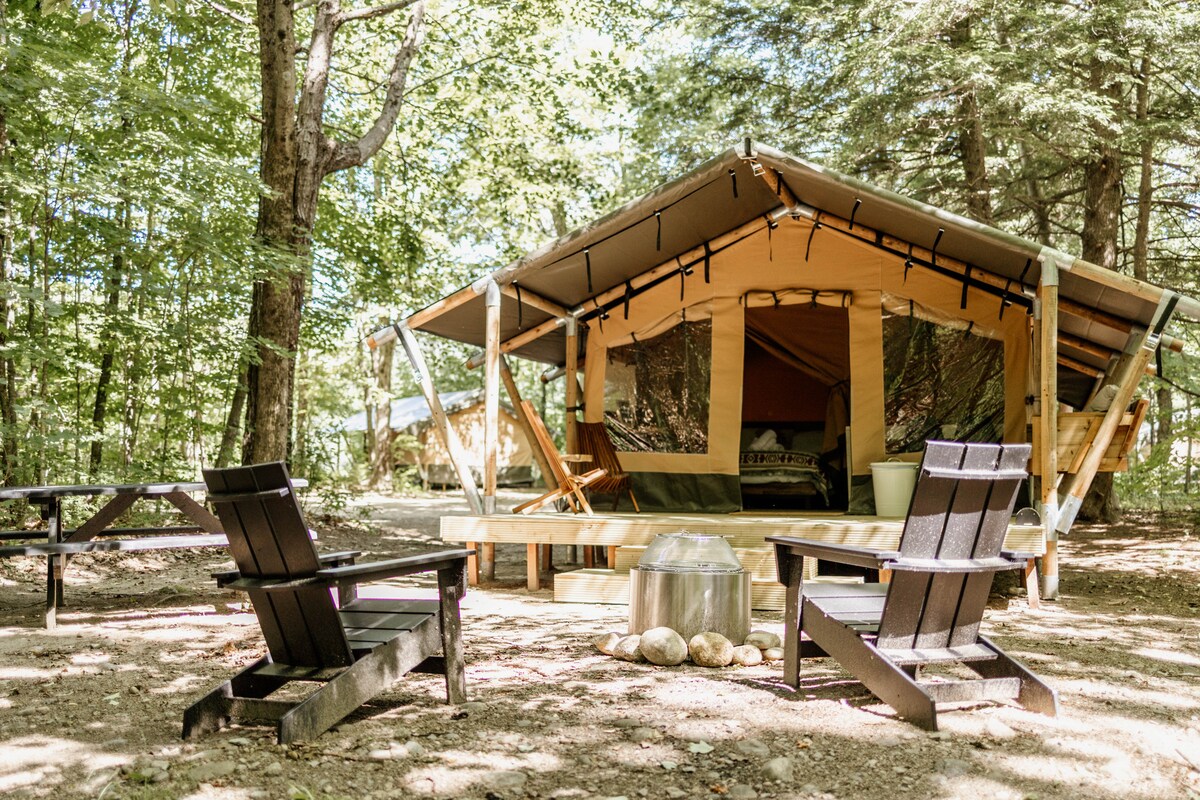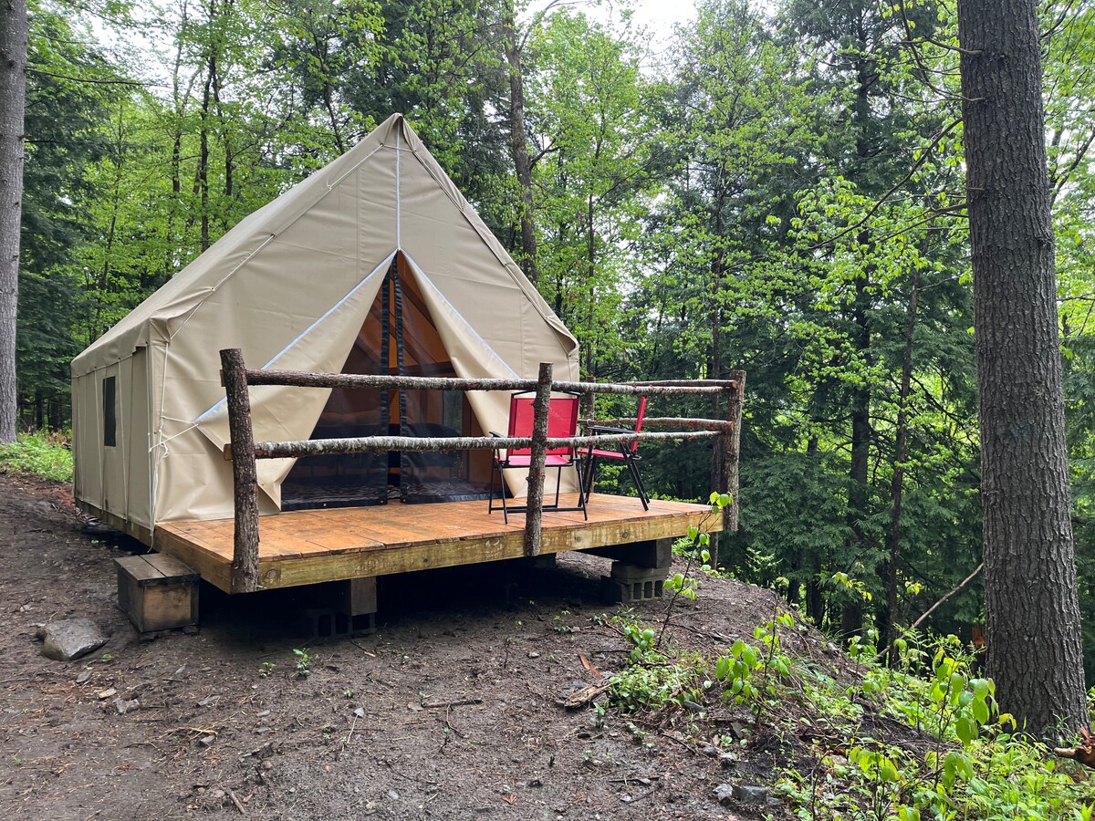 Disfruta de los sonidos de la naturaleza cuando te hospedes en este lugar único. Nuestra tienda de campaña Glamping está equipada con una cómoda cama completa y una cama individual, además de todas las sábanas. Perfecto para estadías con amigos o familiares. Tu propio lugar privado con una parrilla de carbón y un fogón. Dirígete al espacio común de Basecamp Lodge para los huéspedes. Allí ofrecemos 2 baños, cocina completa, TV, WIFI, espacio de trabajo, una tienda de regalos para explorar nuestras tablas de cortar hechas a medida, camisetas, ¡además de increíble jarabe de arce! Trae tus zapatos de senderismo y explora nuestros senderos :)
