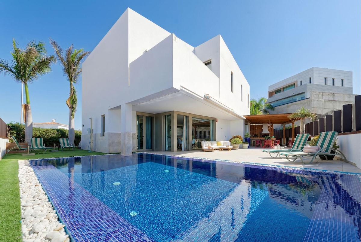 Esta moderna Villa esta situada en primera línea mar, con acceso directo al paseo marítimo de San Agustin, con unas vistas inmejorables, Piscina privada y climatizada con jacuzzi integrado y cascada. Terrazas amplias exteriores. 3 Dormitorios, 2 baños con ducha, salón amplio con wifi, smart TV, pantalla de 75 pulgadas. Aire Acondicionado en todos los dormitorios y en el salón. 2 Parkings privados con posibilidad de carga para coches eléctricos. Zona muy tranquila. Maximo 6 personas.