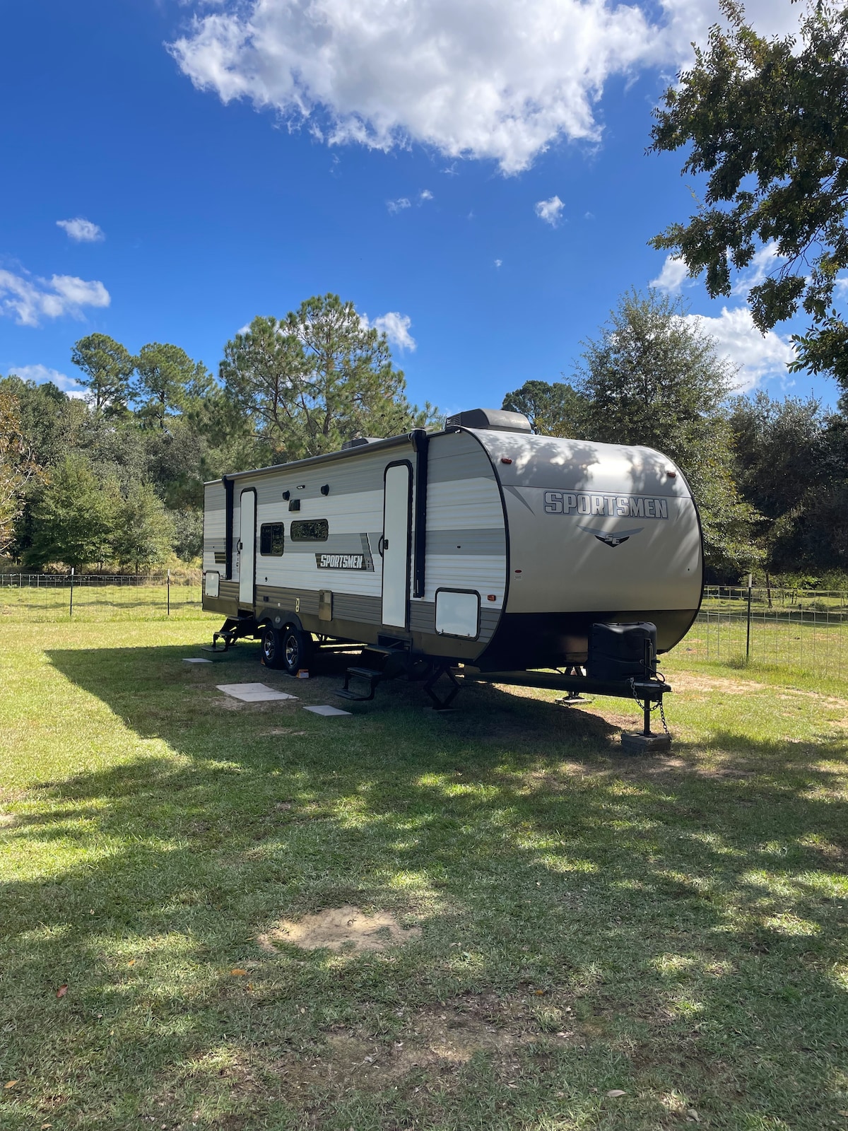 Nuestra caravana Heartland Sundance de 27 pies está preparada para los huéspedes en un pequeño terreno en la parte delantera de nuestra propiedad agrícola. Los huéspedes tendrán una gran vista de nuestros pastos con nuestro pequeño rebaño de vacas y caballos. Esta zona está preparada para una experiencia de glamping. Esto incluye un pozo para hacer fogatas, sillas y parrilla al aire libre. La caravana tiene 1 dormitorio principal, 2 literas individuales, la mesa y el sofá también se convierten en camas. Esta caravana es 1 de 2 caravanas ahora disponibles en nuestra granja.