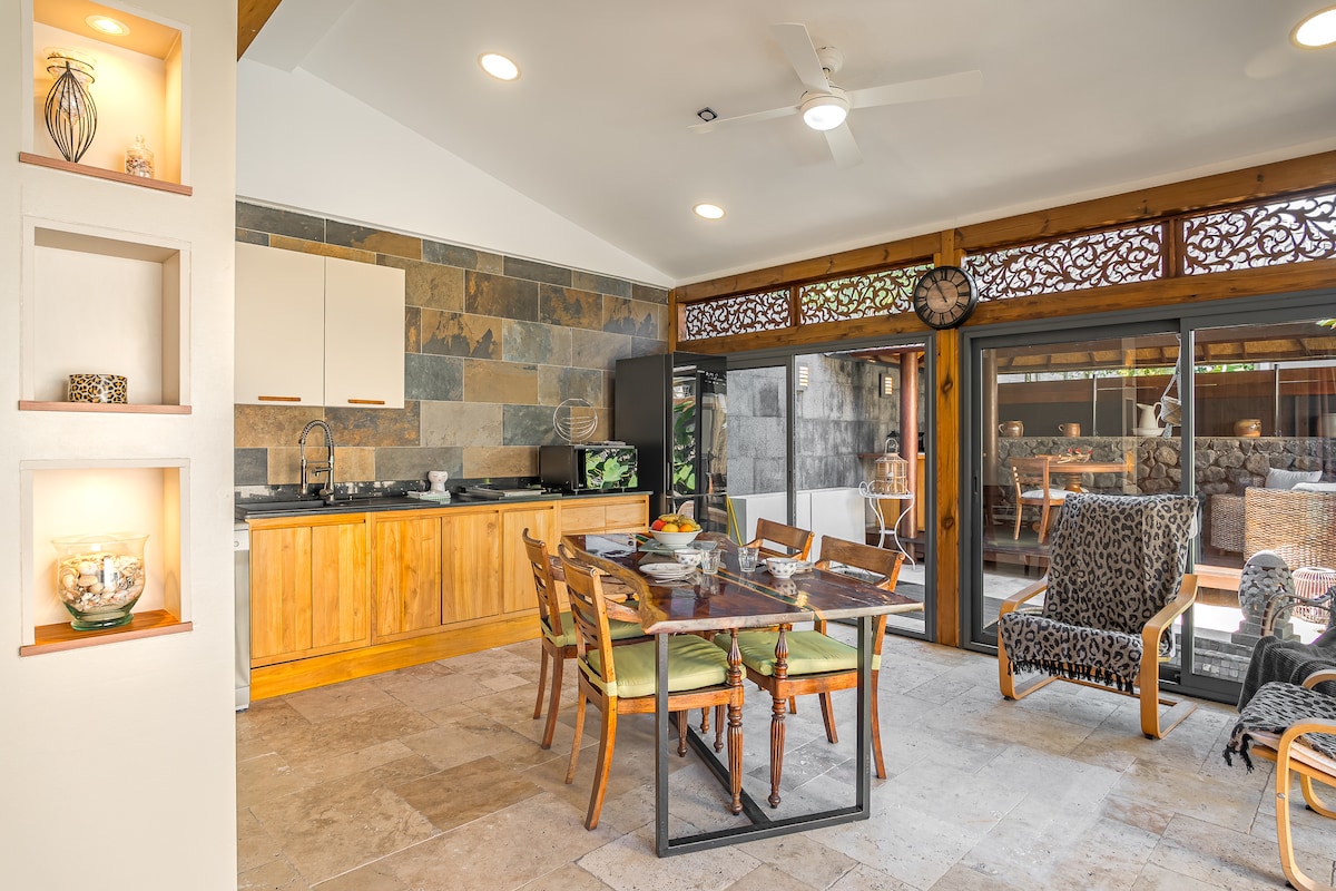 Estudio totalmente equipado con aire acondicionado con cocina con cafetera Nespresso, baño con ducha italiana, inodoro, estacionamiento privado, vestidor, pequeña sala de estar, wifi, televisión, 2 terrazas exteriores privadas, una en la entrada cerca del spa con una sala de estar y otra inmersa en el bosque. Está en un nido aislado del mundo en la fauna y flora de Reunión. Posibilidad de aparcar su vehículo de forma segura en el patio. Acceso al spa totalmente privatizado