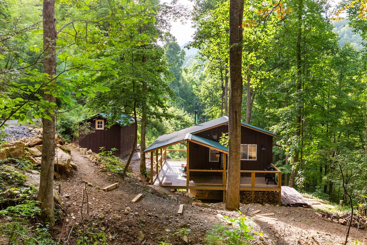 Take it easy at our beautiful cabin in Hot Springs, NC surrounded by nature and farm animals. Panther Branch Farm spans 30 acres of mountains, streams, waterfalls, and hiking trails. On our small farm we have chickens, bees, goats, and alpacas that love to be hand-fed. Originally a pole barn workshop, the cabin has been expanded into a peaceful retreat built with local lumber. Unwind in our outdoor spa with sauna and a spring bath or simply relax and take in the serenity of the National Forest.