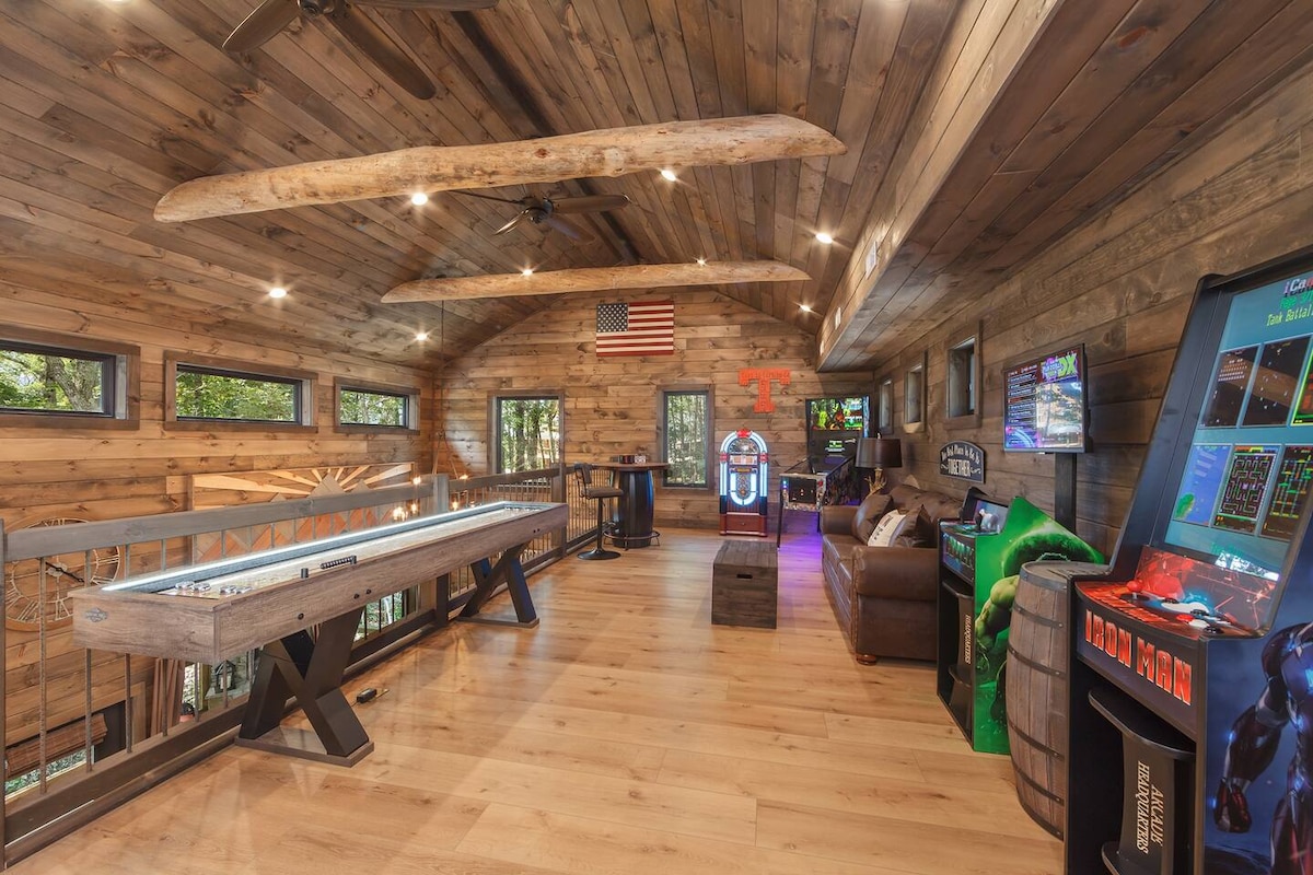 Escápate a una cabaña bellamente actualizada diseñada para la máxima relajación y diversión. Ya sea que estés buscando un refugio romántico o unas vacaciones familiares memorables, esta cabaña ofrece todo lo que necesitas para una estancia inolvidable. ¡Nada todo el año en tu propia piscina privada climatizada cubierta, desafía a tus amigos a una partida de billar o en el juego multicade, o disfruta de una acogedora noche de cine en uno de los tres grandes televisores de pantalla plana y la gran pantalla de proyector! Anfitrión: KickBackStays. ¡Donde el lujo se une al relax!