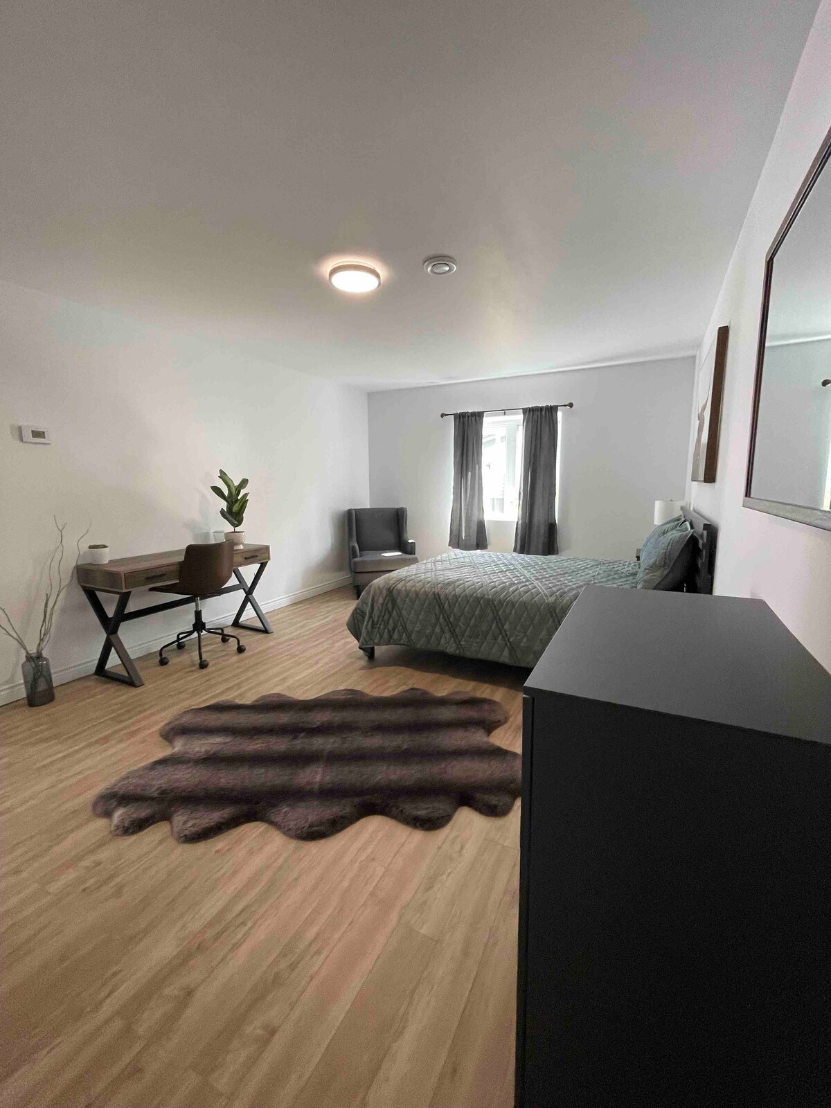 La suite de invitados White Crow, en el nivel inferior de nuestro alojamiento. Hay mucha luz natural en todo el espacio. Disfruta de un sueño tranquilo en una cama tamaño queen con persianas opacas. Baño privado. A minutos de la autopista 104. Entrada propia, entrada privada. 5 escalones interiores a la suite independiente. Gran patio trasero privado. Cocina completa (cocina de 4 quemadores; 3 en 1: microondas/horno tostador/freidora de aire; olla mágica; ollas y sartenes, etc.). Acceso compartido a la lavandería y a la fogata. Cuna con colchón o corralito, bajo petición. *Se admiten mascotas: 25 dólares por estancia.