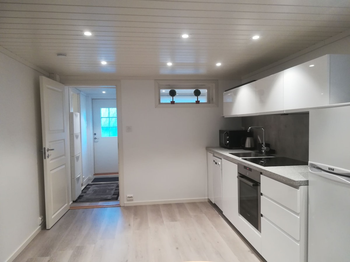 Leiligheten ligger i sokkeletasjen i et bolighus ved sjøkanten i Arendal. Leiligheten er nyoppusset med nytt kjøkken med oppvaskmaskin og mikrobølgeovn. I stuen er det både sittegruppe og spiseplass. Det er mulighet for å sette inn en barneseng ved behov. Det er tilgang til å bruke hagen på utsiden av leiligheten. Tilgang til å bade/sjøkanten avtales med verten.