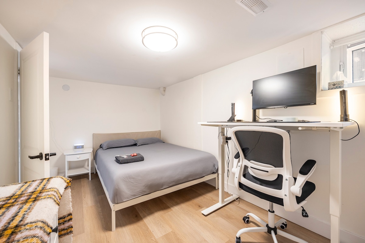 Nuestro sótano con entrada privada con teclado en el West End arbolado de Toronto es ideal para turistas o personas que vienen a la ciudad a trabajar. Fue completamente renovado a principios de 2025 con un ambiente de viaje vintage de los años 50 que te encantará. Baño nuevo, dormitorio completo separado con cama tamaño queen (colchón ENDY), TV, escritorio, además de sala de estar con chimenea y sofá cama. También hay una cocina pequeña/lavandería. A 3 minutos a pie del metro Jane. Techo de 6'5" con 1 viga inferior. Vivimos arriba, la unidad está aislada por ruido.