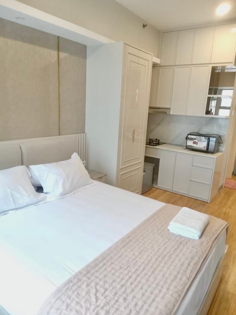 1BR, 380sqft (35 sqm), Gres & Full-Furnished Deluxe - Queen bed (160x200cm) dengan matras pocket spring premium + gorden blackout mewah - TV HD 32" + sofa bed lipat (dihuni 3 orang) - Dapur lengkap dengan kompor listrik, kabinet aluminium - Lengkap dengan shower, bidet, water heater (posisi atas) - 29 fasilitas lengkap!