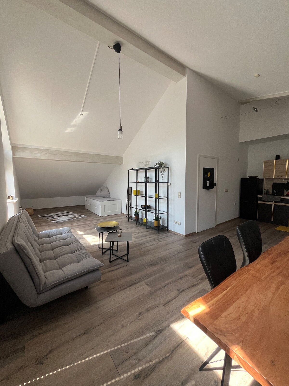 El apartamento en el ático es de nueva construcción y tiene un buen aislamiento térmico. La conexión con el centro de la ciudad se realiza a través de varias líneas de autobús (gratis los sábados) o a pie en unos 30 minutos. Las tiendas (Aldi, Denn's, Edeka, dm, panaderías, carnicerías, caja de ahorros, farmacia) están a poca distancia a pie, a unos 100 m. A pocos minutos a pie se puede empezar a descubrir la naturaleza en los campos y bosques.