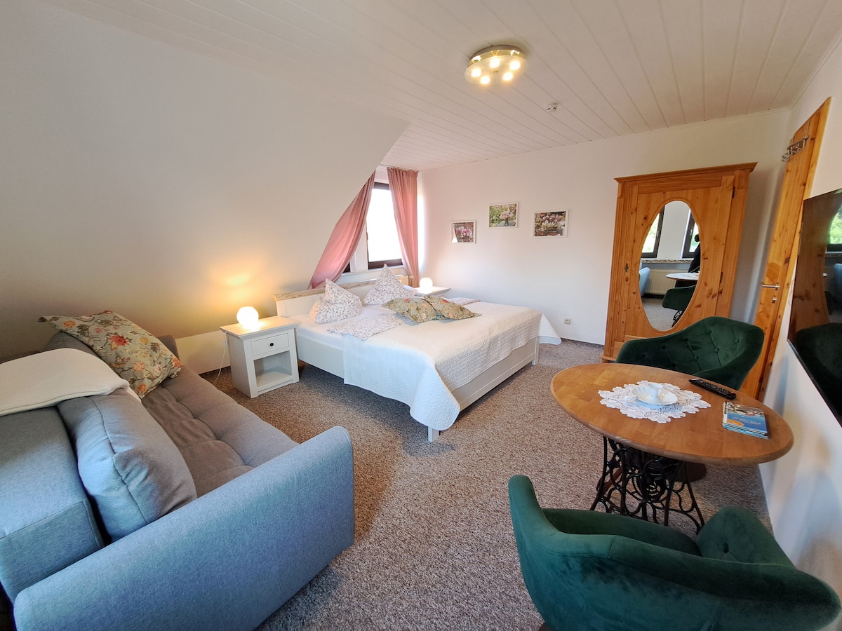El oasis para amantes frescos: más de 60 metros cuadrados de pura relajación. Incluye dos amplias terrazas con fantásticas vistas. Dormitorio con cama doble, ducha grande y sala de estar con sofá cama. Acceso muy accesible. Espacios luminosos, inundados de luz, de forma individual y amorosa. Muebles seleccionados individualmente en arreglos armoniosos en un ambiente especial.