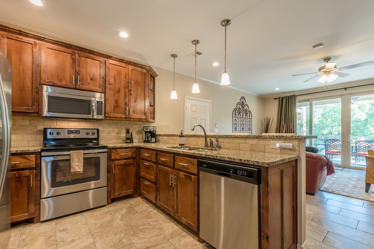 Actualizado 2 camas/2 baños ubicado en el río Guadalupe. A minutos del centro de New Braunfels y Schlitterbahn, este condominio ofrece fantásticas actualizaciones y una hermosa vista de la vida silvestre y las áreas de picnic. Encimeras de granito, lavabo profundo y baños recientemente renovados. Termostato y cerradura de puerta inteligentes. Navega por el río Guadalupe y sal en el punto de Waterwheel (¡no es necesario conducir!). El complejo cuenta con ascensores, 2 piscinas, 4 jacuzzis, áreas de picnic con mesas y parrillas.