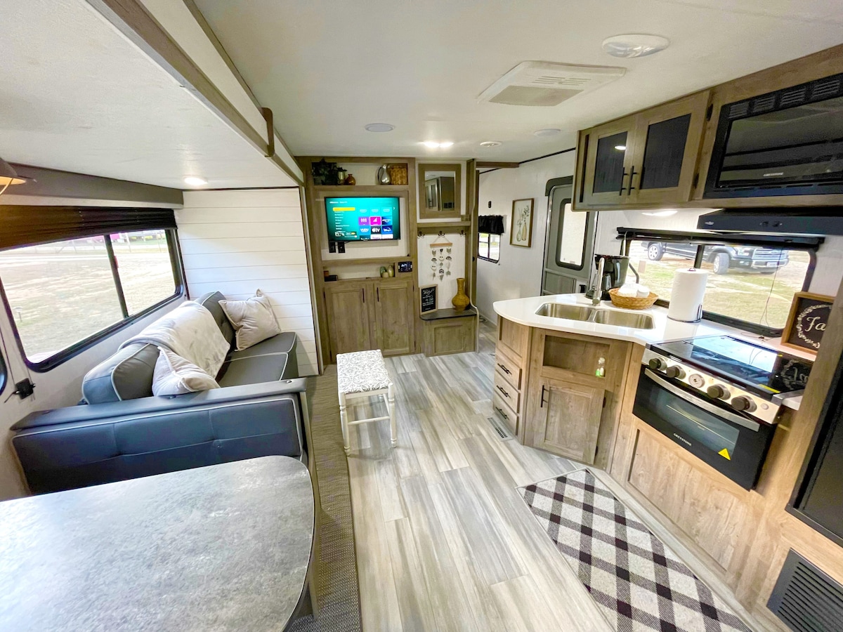 ¡Escápate al corazón de Texas en nuestra acogedora caravana Pioneer 2021! Perfectamente situada cerca de New Braunfels, Gruene y Canyon Lake, esta casa rodante ofrece un punto de partida conveniente para explorar. Disfrute de cómodas comodidades, como climatización y agua caliente, con capacidad para hasta cinco huéspedes si se convierte el sofá en cama. ¡Tu aventura de acampada sin complicaciones te espera!