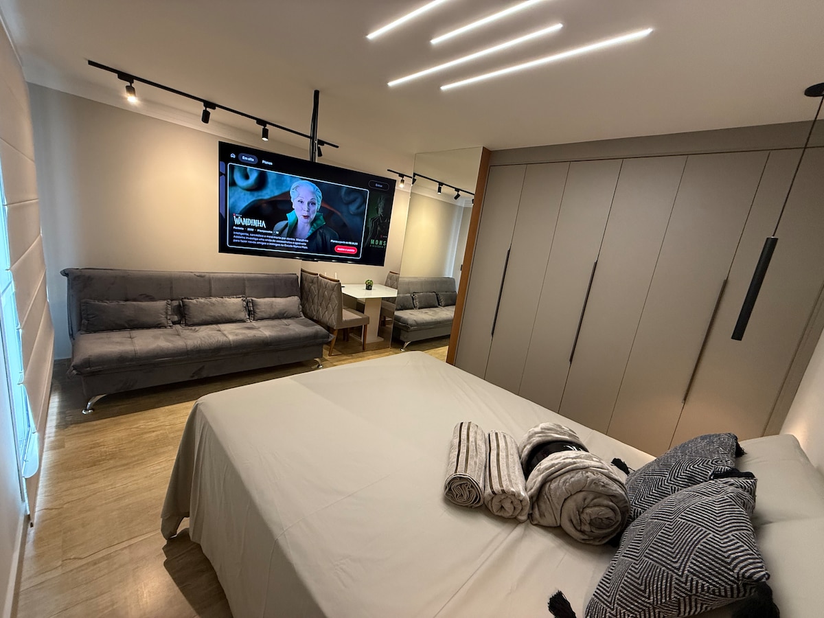 Nuevo estudio, decorado por un arquitecto. Con plaza de garaje cubierta. Ubicado en la avenida más noble de la región. Área de ocio completa en la azotea. Varias opciones de restaurantes, bares, discotecas, compras. Parque arbolado, bosque maya, excelente para hacer ejercicio y caminar al aire libre. Completo con cerradura de check-in autónomo. Ropa de cama y toallas debidamente higienizadas. Utensilios domésticos, Smart TV con Netflix, Wi-Fi, cortinas opacas, edificio nuevo, apartamento impecable.