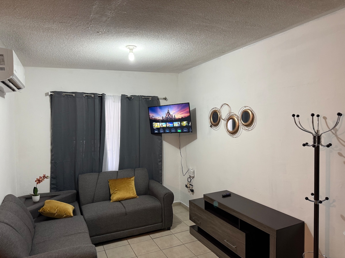 Relájate con toda la familia en este alojamiento donde se respira paz y tranquilidad, cuenta con dos recámaras, sala, comedor climatizadas, internet de 100 megas, wifi, antecomedor de 4 sillas, sofá cama, cocina, TV 49" con cable, refrigerador, horno microondas, licuadora, tetera para calentar agua (café) platos, cuchillos, cucharas, tazas, sartenes, olla, agua caliente en baño etc.