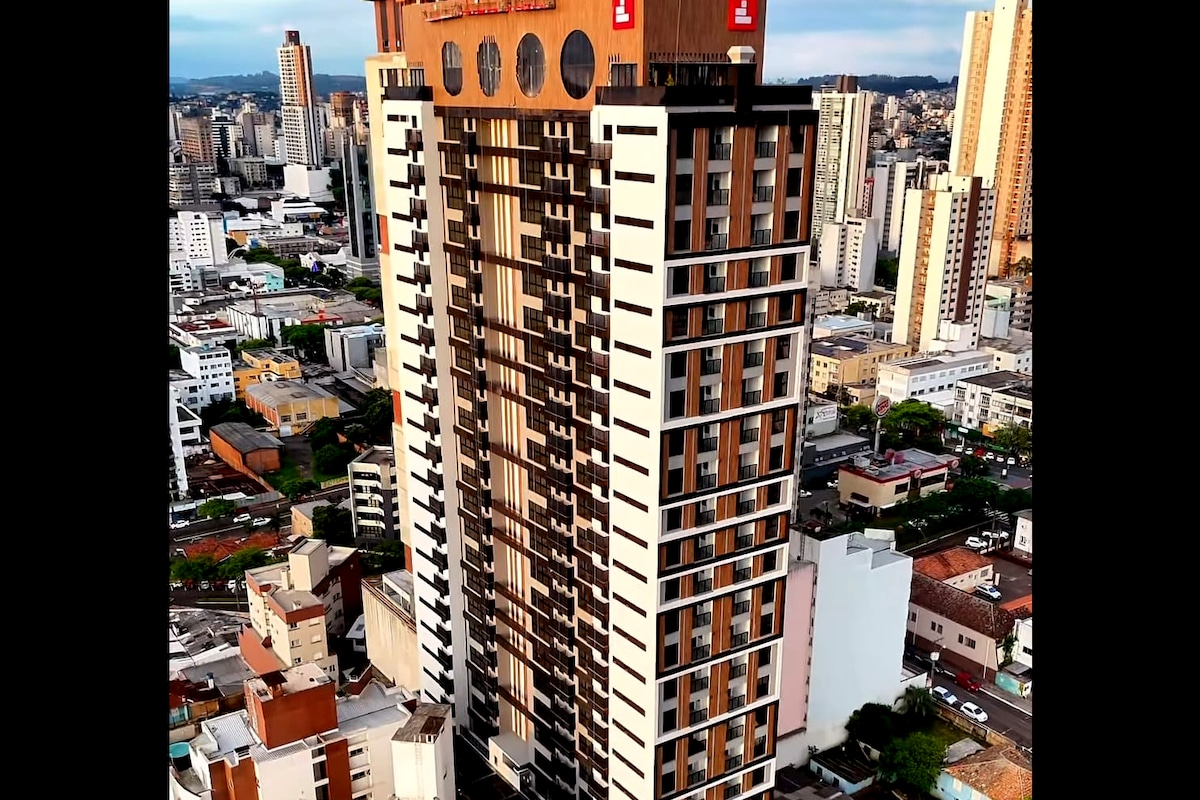 Estudio elegante y funcional en el edificio Z Convivence, en el centro de Chapecó. Ideal para viajes de negocios, ocio o consultas médicas. El edificio ofrece gimnasio, piscina (según temporada), rooftop con vistas increíbles, coworking, portería 24h y mini mercado. El estudio dispone de cama box con sábanas de 600 hilos, aire acondicionado frío/calor, Smart TV, Wi-Fi rápido, cocina equipada y baño de calidad.