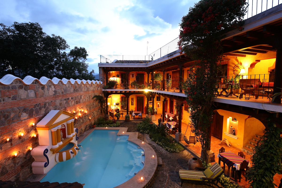 Enjoy a personable stay in my classic Colonial home just six blocks from Antigua's Central Park. It features a central courtyard, complete with gardens and out-door dining where you will enjoy a delicious Continental Breakfast (included in the price).....and it is decorated with local Maya art and textiles. Room #4 is a cozy, single room with a single bed and a window facing west with lots of sun and views of volcanos AND it has a private bath.