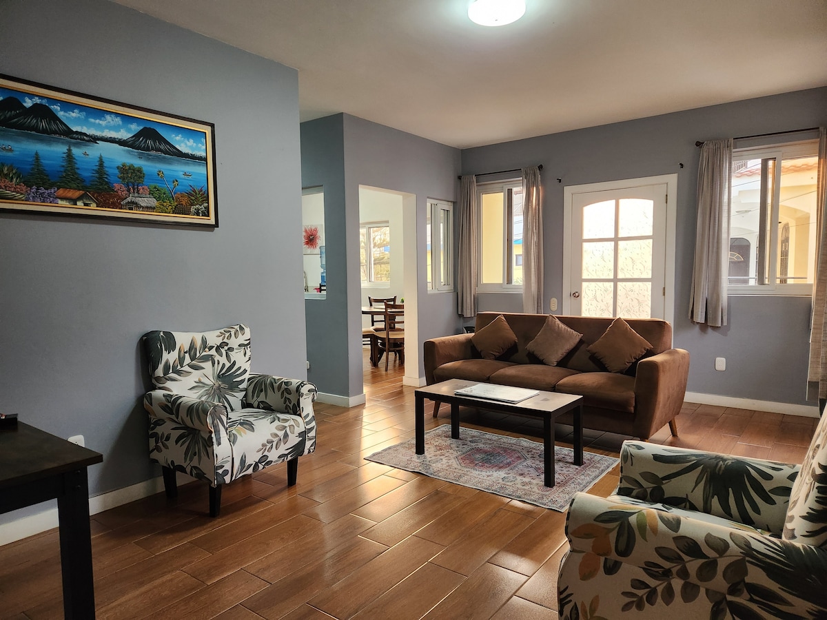 Apartamento en Ciudad San Cristóbal, un lugar seguro y tranquilo. Contamos con: un cuarto principal con cama king size y baño privado con una tina de agua caliente, un segundo cuarto con cama imperial, cocina equipada, sala principal con chimenea, parqueo para un vehículo, churrasquera y hamaca. La antigua Guatemala está a 15 km y el Aeropuerto Internacional La Aurora a 7.4 km del apartamento. Accesibles supermercados y restaurantes. Brindamos servicios de comida y bebida (Cobro adicional)