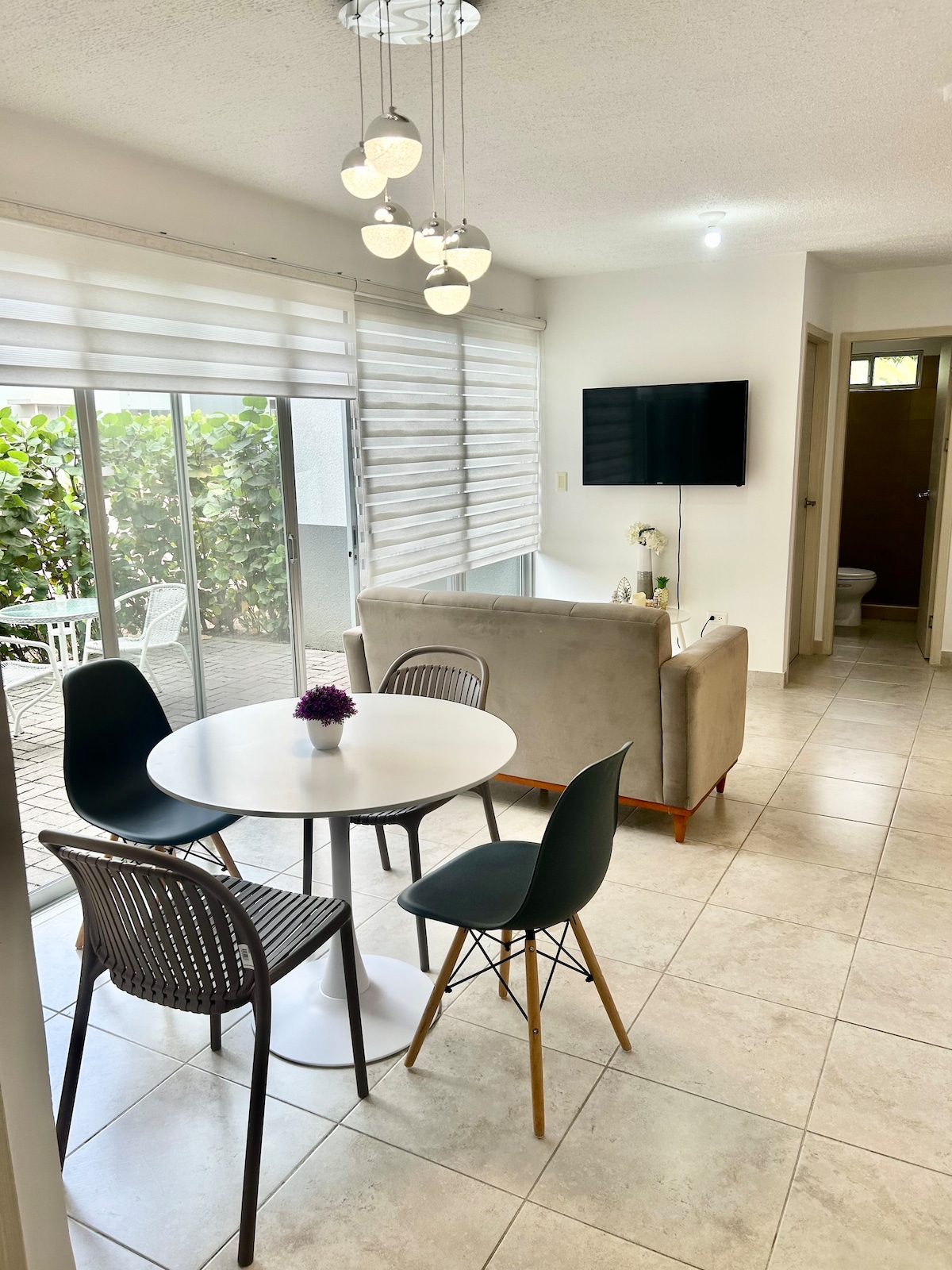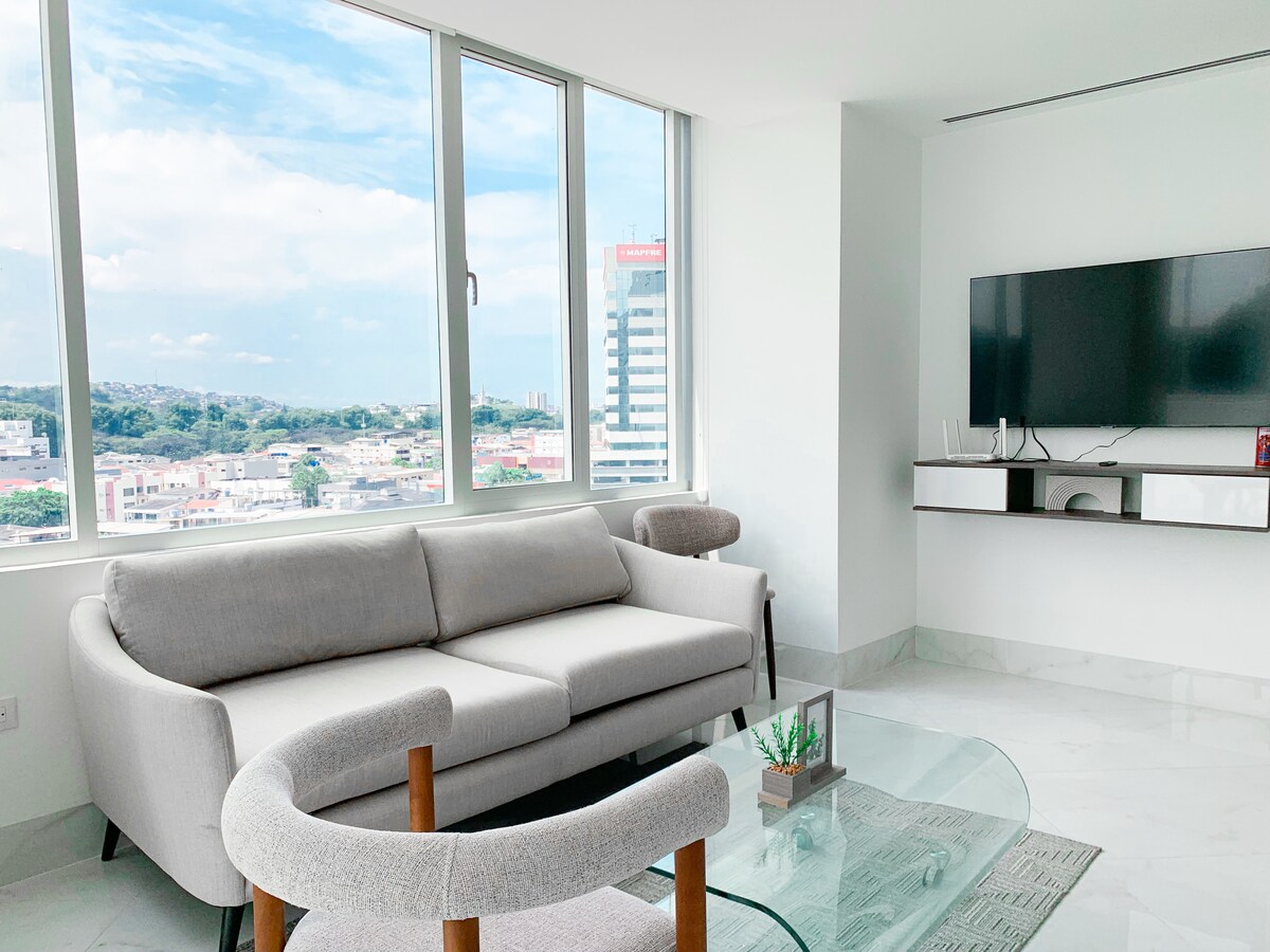 Disfruta de un espacio nuevo, elegante y minimalista. Cuenta con: -Cocina equipada -Comedor -Baño moderno -Parqueo privado -Habitación con cama Queen -Colchón inflable para 2personas adicionales Perfecto para viajeros que buscan comodidad y privacidad con una ubicación estratégica: -6min al Terminal terrestre -8min del Aeropuerto Internacional -15min del Malecón 2000 -15min de Samborondón
