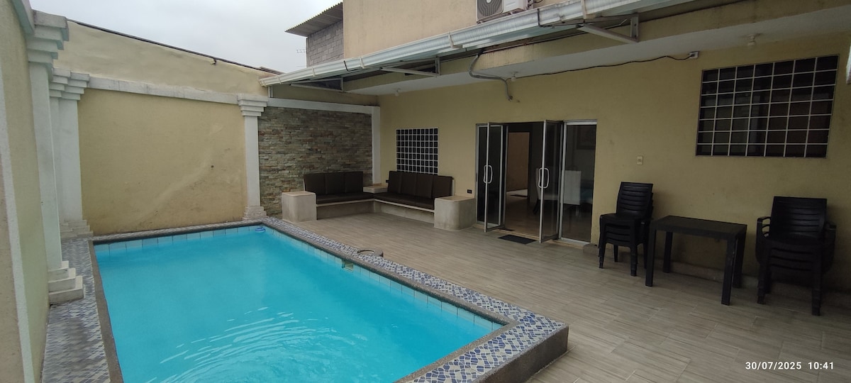 Lindo departamento, planta baja de una casa, totalmente independiente, con Piscina, BBQ, Garage. Ubicado en un lugar estratégico de Guayaquil, cerca a empresas públicas y privadas. Nota: No permitimos reuniones ni llevar parlantes de sonido, en el área de la piscina contamos con una barra de sonido con volumen suficiente para compartir en él área. El hospedaje es solo para el número de personas que se detalla en la reserva, personas adicionales deben ser declaradas para envío de tarifa especial.