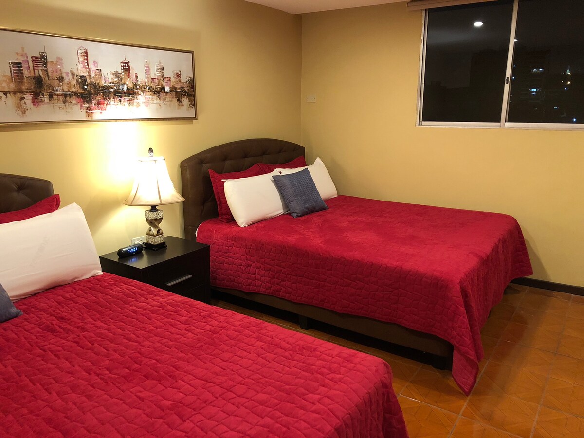 Suite amoblada, perfecta para 2 a 3 personas con excelente ubicación. Cuenta con todos los servicios para que se sientan en casa y puedan tener una linda experiencia. *Servicios: - Tv con Netflix y Youtube - Wifi de alta velocidad - Piscina - Gym *Ubicación: A lado del Omnihospital (Farmacia 24/7) Aeropuerto a 5 minutos en carro Frente al Mall del Sol Cerca del Centro de Convenciones. *Parqueo: - Público (Gratis fuera del edificio) - Privado ($8 a $10 por noche según disponibilidad)