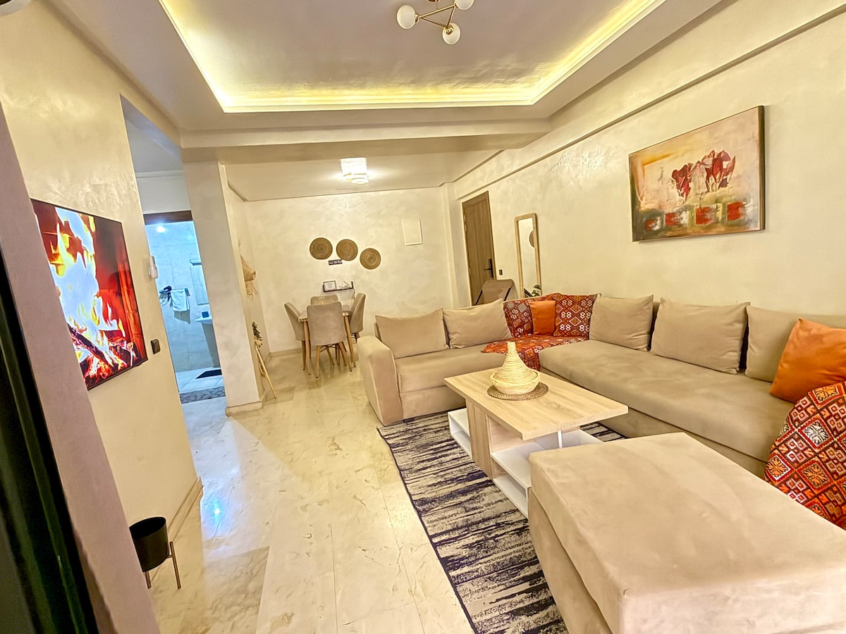 Nuestro apartamento está convenientemente ubicado en el corazón de Marrakech. A poca distancia a pie de la estación de tren, numerosas cafeterías, restaurantes, tiendas de comestibles y supermercados. El aeropuerto está a solo 12 minutos en coche, por lo que es ideal para los viajeros. • La propiedad ofrece wifi de alta velocidad, Netflix e IPTV, aire acondicionado, piscina cubierta, gimnasio, aparcamiento privado y cubierto, y seguridad y vigilancia las 24 horas, los 7 días de la semana.