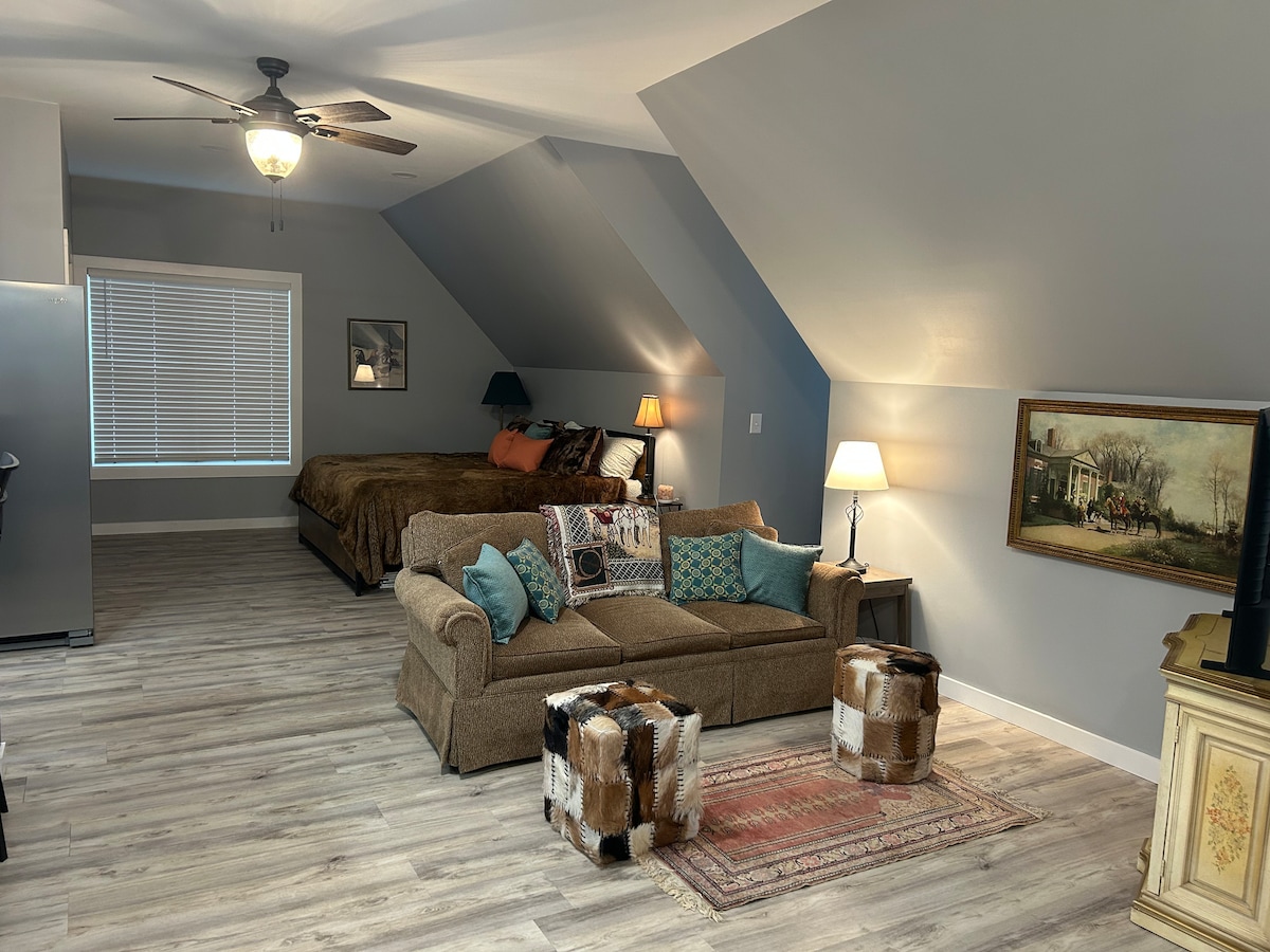 Te damos la bienvenida a Tranquility, un apartamento estudio con la estación de carga Tesla EV. Nuestro acogedor estudio (perfecto para 1-2 huéspedes), de ~300 pies cuadrados bien equipado, se encuentra sobre un garaje separado (con un abridor de garaje ultra silencioso) con entrada separada en la misma propiedad que nuestra casa unifamiliar en Old Irving Park en Greensboro. Disfruta de total privacidad en un entorno seguro, tranquilo y boscoso y sigue estando cerca de restaurantes y tiendas. Amplio estacionamiento en la entrada o en la calle. ¡Se admiten mascotas también!