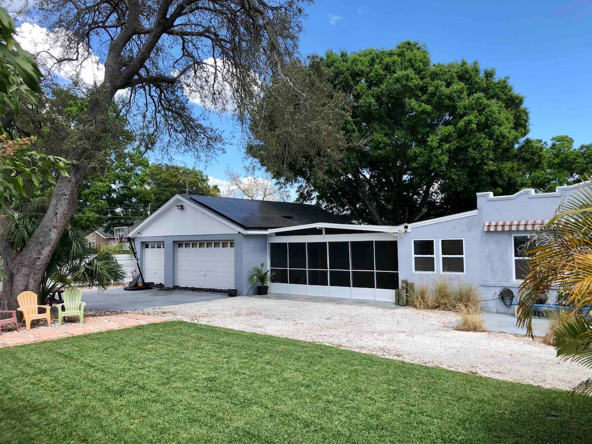 Message for open dates not on calendar. Spanish Mediterranean style with rustic charm and modern amenities compliment this homes beautiful exposed brick and stained glass doors. The outdoor living space is amazing with a screened in 30’x30’ breezeway for perfect FL living. Lush tropical landscaping, a great yard and tons of parking on a completely fenced in 1/2 acre lot and all the privacy guests could ask for. Located just 5 minute drive to Central Ave. Downtown St. Pete.
