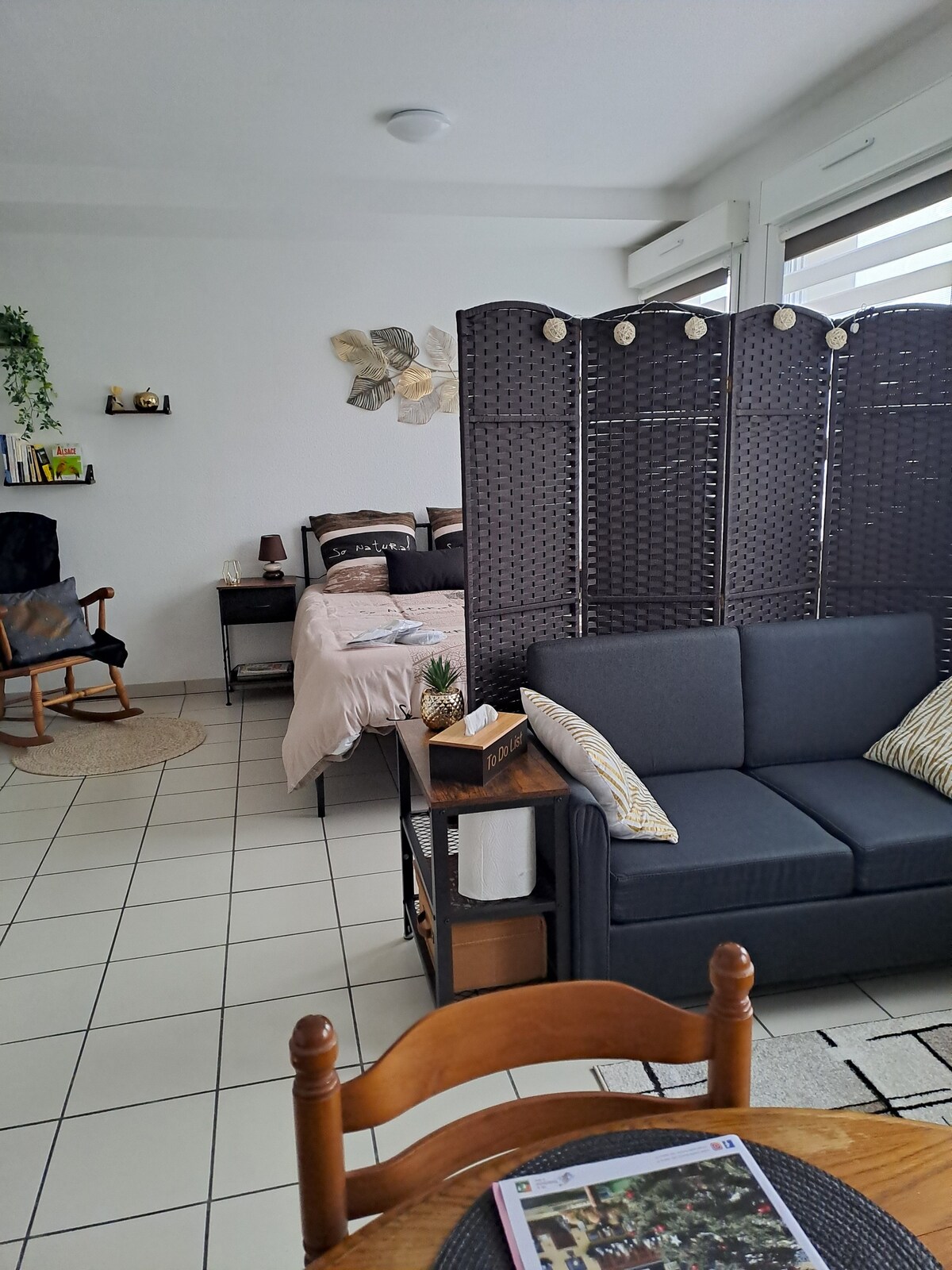 Apartamento de 2 habitaciones de 30 m2 en la planta baja del jardín: - dormitorio con 1 cama de 140 x 200 cm - sala de estar equipada con un sofá cama convertible - cuarto de baño con ducha, inodoro - cocina equipada con lavavajillas, horno, microondas, hervidor, cafetera … En el corazón de una casa de varios apartamentos tranquilos en un entorno verde. Sábanas (camas a hacer por el viajero) y toallas disponibles incluidas en la tarifa de limpieza.