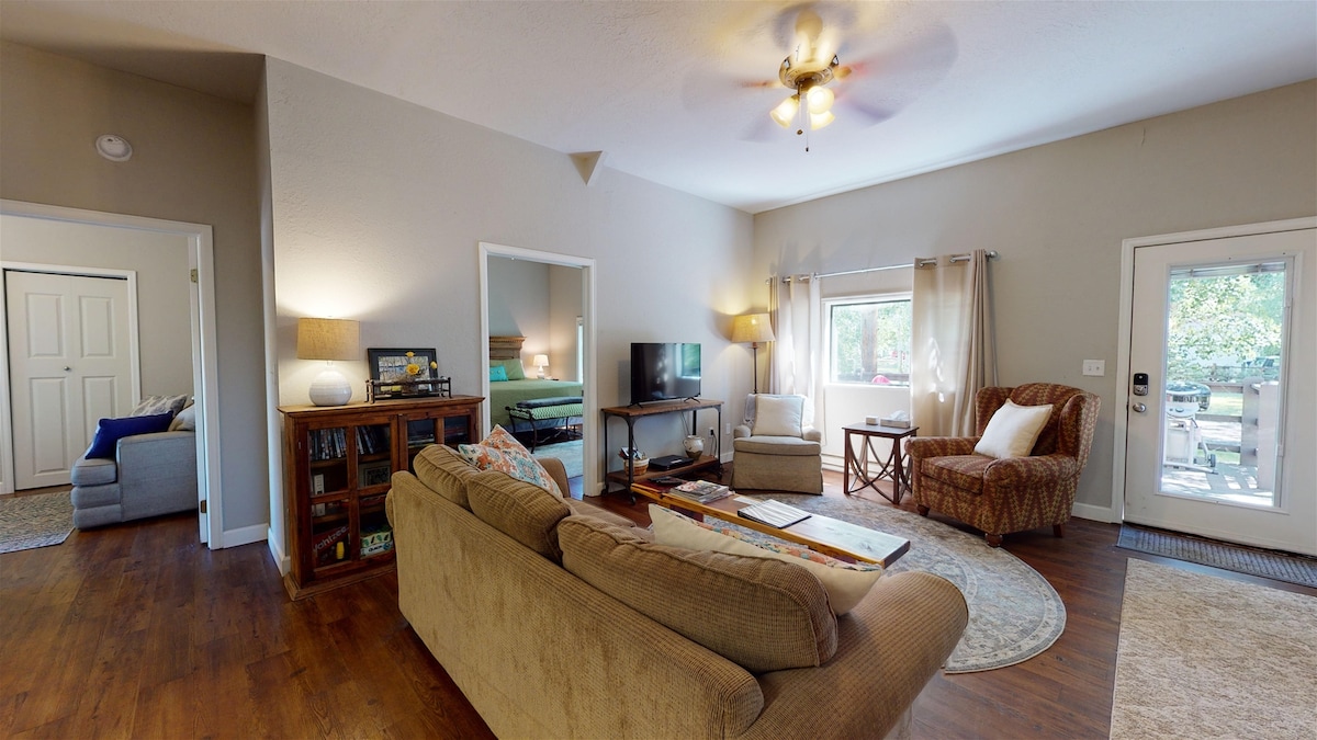 A solo una milla de la autopista 65 se encuentra Tongue Creek Ranch. El rancho está ubicado en el fértil valle de Tongue Creek y Surface Creek. Disfruta de tu propia casa de campo privada de 2 camas y 1 baño. Ambos dormitorios tienen una cama tamaño queen con la parte superior acolchada súper cómoda. El wifi es una línea de fibra óptica rápida de 1 gig. Disfruta de una cocina completa, lavadora y secadora, y un sofá cama en la sala de estar. El patio delantero siempre está a la sombra. Pregunta por la cabaña opcional en el sitio para usarla como una habitación privada separada para la familia que se desborda.