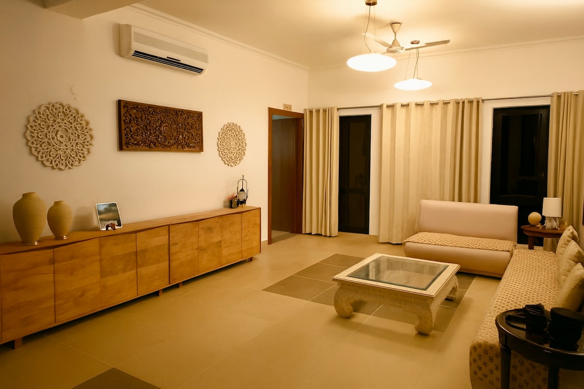 Ours is a large bungalow, situated in an upscale, green, serene area surrounded by other beautiful independent bungalows and farmlands. It is located in a gated complex with 24/7 access control. We are 20-25 minutes away from the airport (T3). It is a beautifully appointed home exuding warmth. Our living space is ideal for people looking for a peaceful vacation which gives solace to the soul, what with a lot of greenery, massive trees, sparrows, parrots, squirrels and peacocks for company.