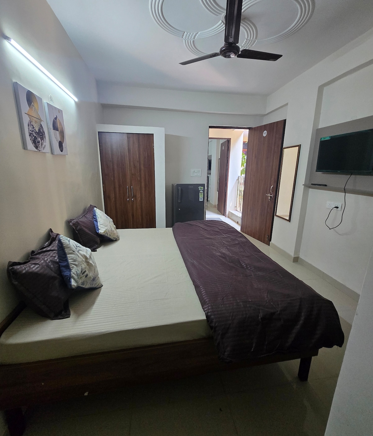 ¡Bienvenido a tu hogar lejos de casa! Nuestra habitación tamaño queen de lujo ofrece una mezcla perfecta de lujo, comodidad y conveniencia. Alójate a pocos minutos del Hospital Artemis, la carretera del campo de golf y la estación de metro Sector 54 Chowk, lo que garantiza una conexión perfecta con la ciudad. Damos la bienvenida a ciudadanos extranjeros.