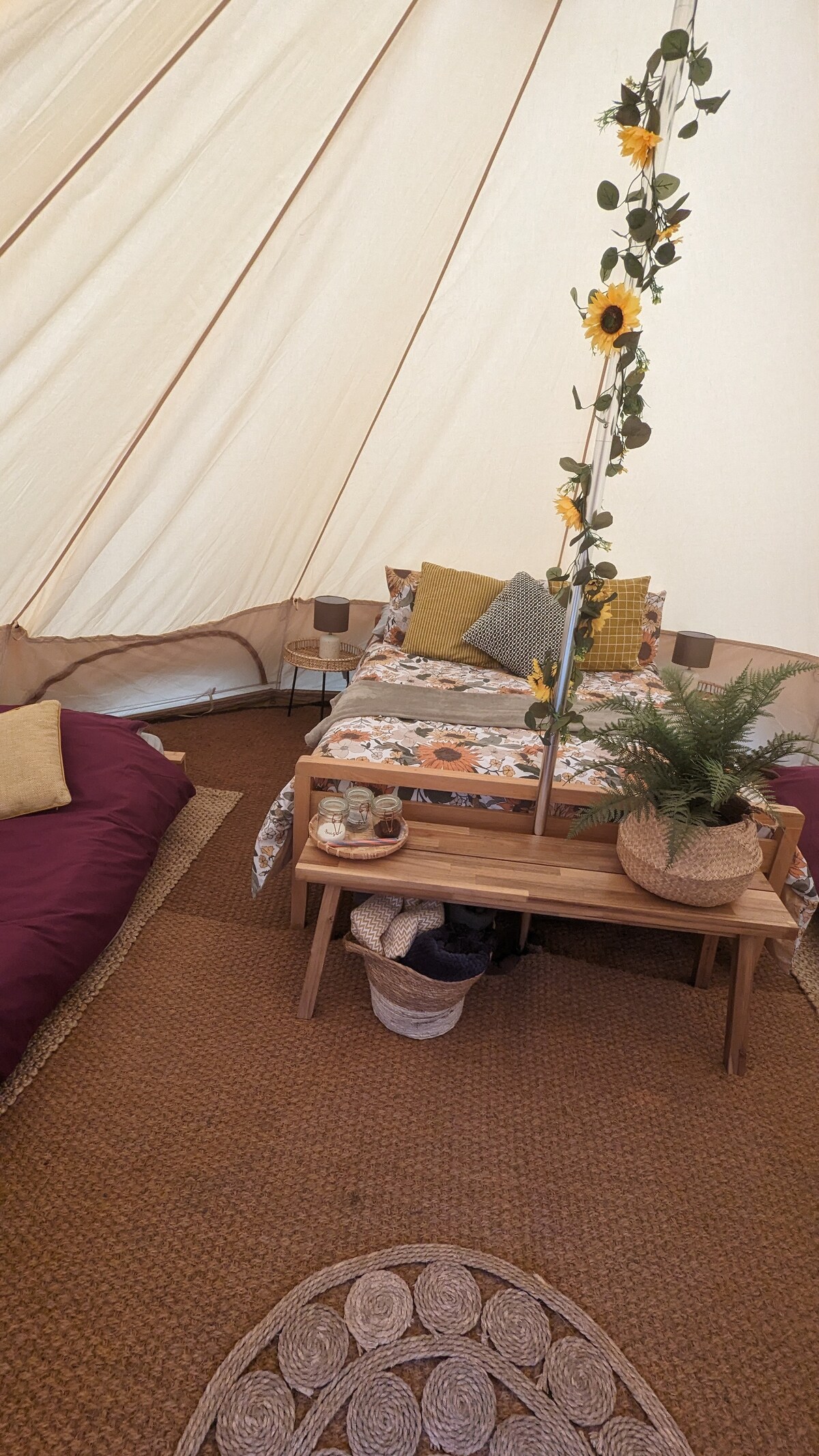 Bell Tent Glamping ubicado en un lugar encantador y tranquilo. Perfecto para dos adultos o hasta dos adultos y dos niños A poca distancia de toda la zona que ofrece, es mejor pasar tus vacaciones de glamping. Hay una ducha/inodoro y área de cocina (congelador, nevera, hervidor, microondas, freidora de aire compartidos), compartidos con nuestro pequeño sitio de caravana. Ambas tiendas de campaña tienen ropa de cama, debajo de la cama, sillas de camping, vajilla, ollas/sartenes, utensilios, troncos, chimenea, encendedores, manta eléctrica, calentador/ventilador eléctrico.