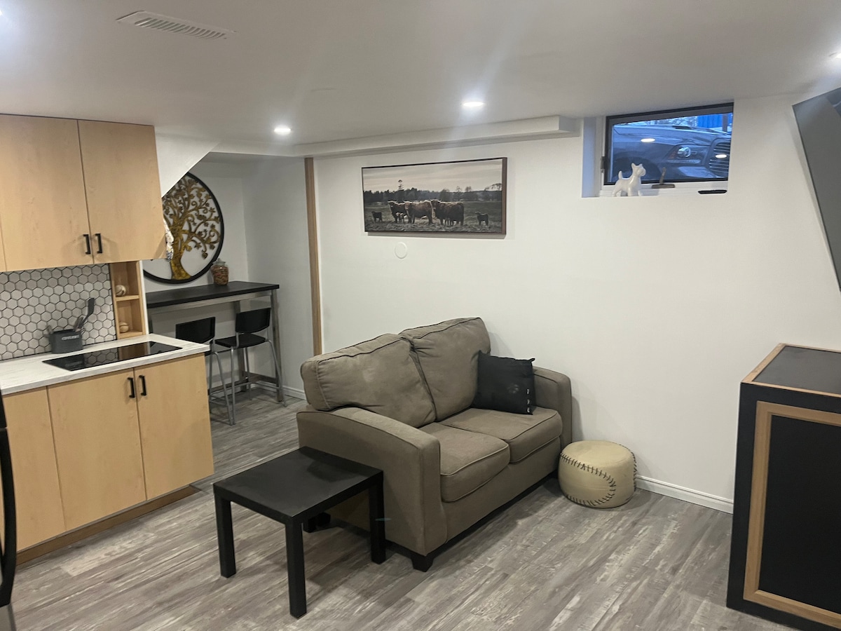 Kick back, reminisce and relax in this calm, stylish space. This basement apartment in South Bedford offers the most important amenities with class. The open concept sitting area is nestled between the dinning and equipped kitchenette. The bedroom offers a comfy king-sized bed, a working area, a dresser and a nightstand. The toilet is equipped with both automatic sensors and energy-efficient flushing mechanism. Finally, a heat pump helps moderate temperatures within the apartment all year round.