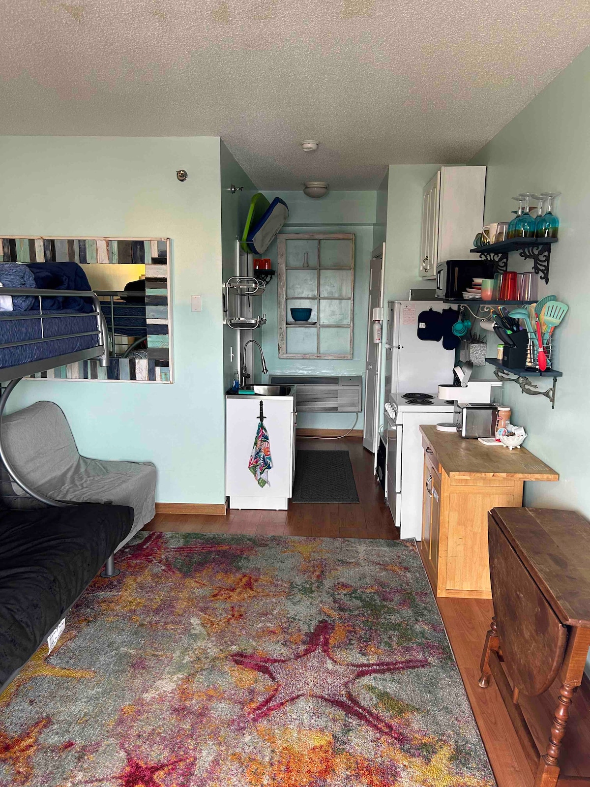 Small (200 sf) recently renovated ocean front studio with an amazing ocean view and assigned parking space in private lot. Studio includes a full bath with tub/shower combination, fully equipped kitchenette and breakfast bar. Furnished with a wall bed / sofa combination that easily converts from day to night. You will enjoy your sleep on the upgraded 10 inch memory foam mattress. Easy access to the unit with a number door combination to be provided before your stay.
