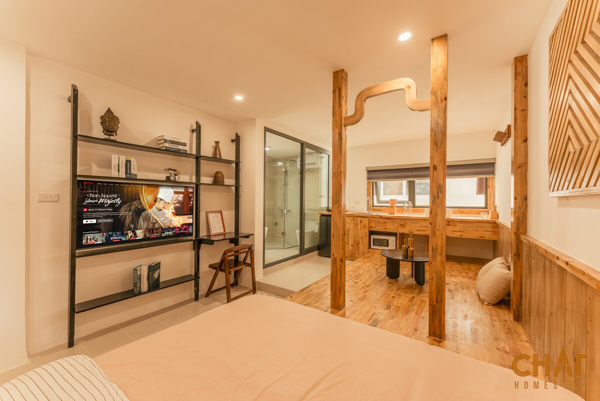 Disfruta del casco antiguo de Hanói desde un refugio moderno a solo unos pasos de la icónica TRAIN STREET. Este apartamento cuenta con una CAMA TAMAÑO SUPER KING, UN SILLÓN CÓMODO y un baño de lujo con ducha y BAÑERA DE MADERA. Cocina en tu COCINA PRIVADA y relájate con el PROYECTOR de 100 PULGADAS y el wifi. Una GRAN VENTANA INSONORIZADA ofrece vistas animadas a la calle, combinando el encanto de Hanói con las comodidades del hogar. Ideal para viajeros que buscan una estancia única y tranquila en el corazón de la ciudad.