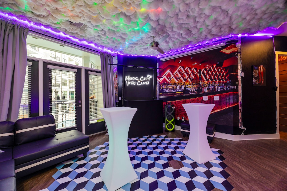 Nashvilleurbanretreats presenta este espacioso alojamiento de 2 dormitorios y 2 baños, que fue diseñado por el mejor diseñador de Nashville. Las puertas correderas conducen a la terraza al aire libre más grande con parrilla en este edificio con ascensor. La terraza tiene un espacio cuidado para comer y entretenerse al aire libre con algunos divertidos juegos al aire libre para relajarse antes de salir al centro de Nashville, que está a 15-20 minutos a pie. Diviértete posando frente a un mural hecho por uno de nuestros muralistas favoritos de Nashville, así como las geniales alas de ángel de neón.