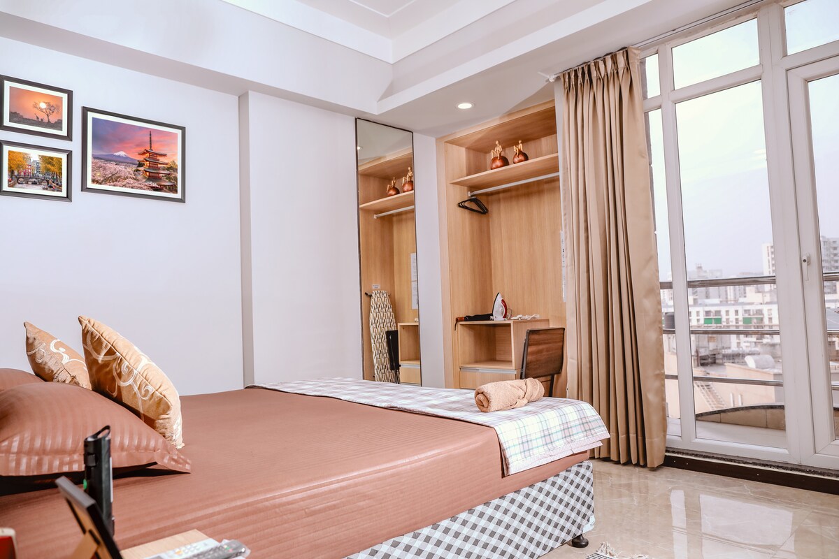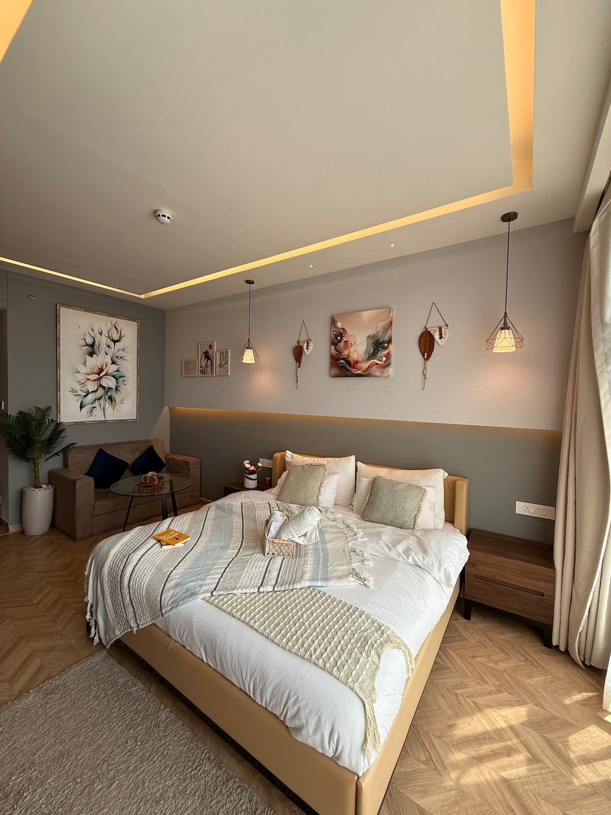 Glittering Drapes: Kandy Romance, una escapada de lujo en el vibrante Satya Element One. Este encantador apartamento es donde el romance se une con el estilo, envuelto en una divertida paleta de rosas y blancos que bailan por la habitación como las luces de una ciudad por la noche. Una joya atemporal, perfecta para aquellos que buscan un refugio con un toque de fantasía. La cama, coronada con suaves y brillantes cortinas, te invita a hundirte en su lujoso abrazo, rodeada de una decoración cuidadosamente elegida que susurra elegancia y encanto.