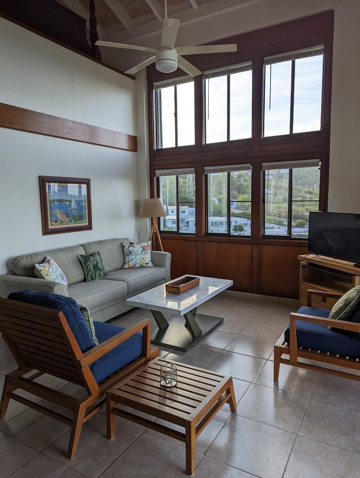 Impresionantes puestas de sol y vistas de un millón de dólares de St. ¡Thomas y las islas circundantes! Este apartamento tipo estudio de 600 pies cuadrados es espacioso, cómodo y está decorado con mucho estilo. Se encuentra en un lugar ideal, a solo 2 minutos en coche de la ciudad, pero en un barrio tranquilo. Se recomienda alquilar un coche, pero no es absolutamente necesario para aquellos que pueden subir colinas largas y muy empinadas. Este apartamento se encuentra en el nivel inferior de una casa privada que actualmente está en proceso de reconstrucción después de los huracanes.
