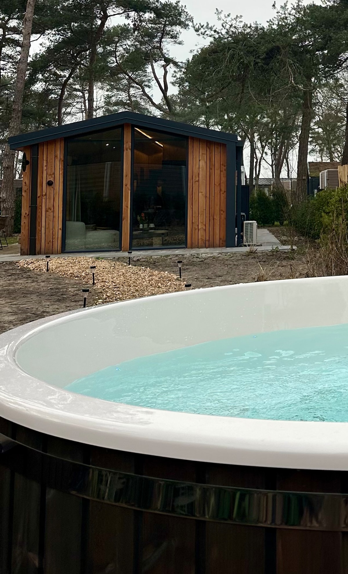 Romántico Wellness Lodge para 2 personas, con jacuzzi, ducha solar y sauna. Un lujoso escondite para disfrutar de la paz, la privacidad y la comodidad juntos.