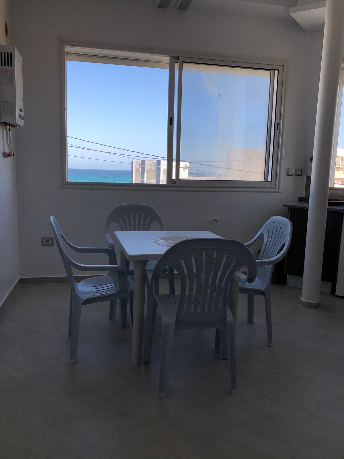 Un apartamento con encanto muy coqueto en el primer piso de un edificio al lado del mar. El edificio está situado en el centro de la ciudad de mahdia cerca de todos los servicios (restaurantes y cafés turísticos, la medina, monumentos históricos, grandes superficies...) justo enfrente de un paseo marítimo muy agradable