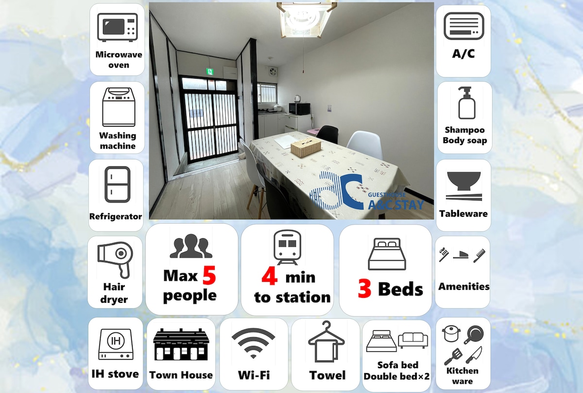 Esta habitación es muy popular entre los viajeros de larga estancia, con una espaciosa habitación de 35metros cuadrados que cuenta con una amplia cocina y comedor. El baño y el inodoro son privados. Está equipado con WiFi y puede alojar hasta 5huéspedes. El área circundante es tranquila, con lugareños amigables y un ambiente seguro. Hay supermercados, calles comerciales, farmacias y restaurantes cerca, lo que le permite disfrutar del estilo de vida local en Osaka. Aeropuerto KIX, sin transbordo.