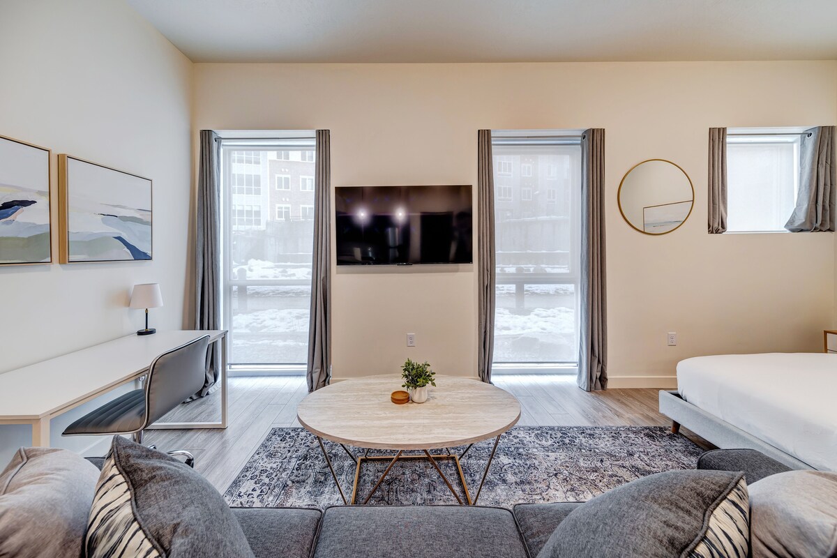 This new modernized studio apartment comes with: ⤷ Huge Gym ⤷ Hot Tub (open all year round) ⤷ Pool (pool is CLOSED for the winter season, it opens up again in May) ⤷ Luxury Clubhouse w/ a Pool Table and Shuffle Board ⤷ BBQ Grills, Gas Firepits, & Pickle Ball Court ⤷ Designated Workspace ⤷ High Speed WiFi ⤷ Full kitchen that comes fully stocked ⤷ Free parking ⤷ Mounted 55" Roku TV giving access to all your favorite streaming apps ⤷ Keurig coffee maker w/ complimentary coffee, creamer & sweetener