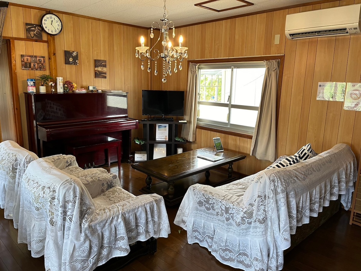 **¡Licencia hotelera obtenida! ¡A solo 2 minutos a pie de la hermosa costa de Miyagi, donde podrás surfear, jugar con el agua y disfrutar de la puesta de sol! ¡A solo 5 minutos en coche de la famosa Villa de los Estados Unidos! Disfruta de toda la villa de dos pisos, con una sensación de lujo y comodidad. Puedes estacionar 3 coches de forma gratuita. Cuenta con 4 dormitorios y puede alojar hasta 9 personas. 2 baños y 2 duchas, ideal para viajes en familia y con amigos. ¡Cocina y sala de estar amplias, utensilios de cocina y vajilla completos, mesa de comedor grande expandible, puedes cocinar con familiares y amigos y compartir buenos momentos! ¡El supermercado y la farmacia más cercanos están a unos 8 minutos a pie, por lo que ir de compras es muy cómodo! ¡Este lugar será la elección perfecta para su viaje de vacaciones! **Al momento de la llegada, debe presentar su pasaporte. **Se puede proporcionar servicio en chino, japonés e inglés. **Esta casa es para no fumadores. **No se admiten mascotas en la vivienda. ##Por favor, regístrese según el número de personas reservadas.##