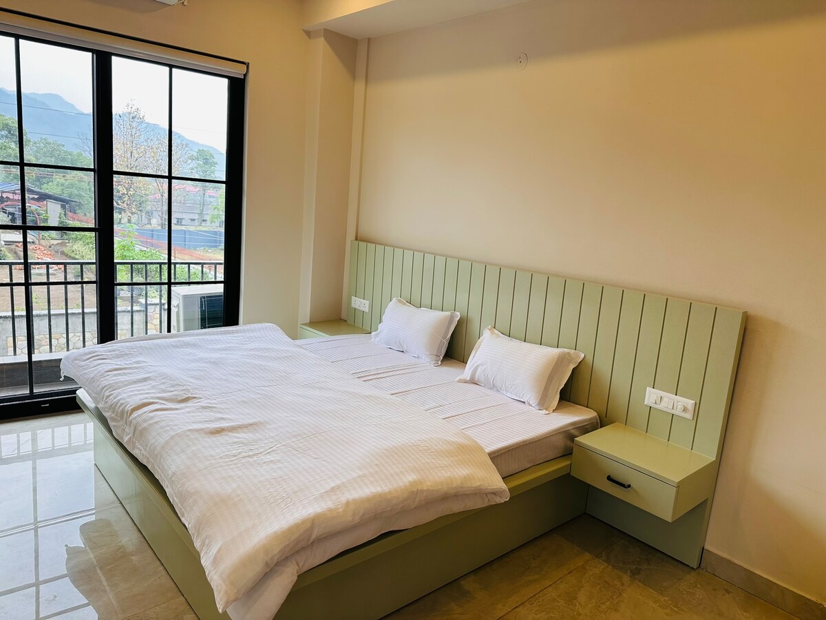 Esta es una cabaña estudio 1RK, amueblada con buen gusto que te haría enamorarte de la "Reina de las colinas". Toda la propiedad ofrece una vista gratificante del valle de Doon. Este estudio tiene una cama tamaño king con suficiente espacio para un colchón adicional. Tiene silla y mesas para comer y trabajo remoto. La cocina está equipada con todas las necesidades. El estudio también tiene TV y nevera. El baño con ducha está bien construido y mantenido, con todas las comodidades modernas.