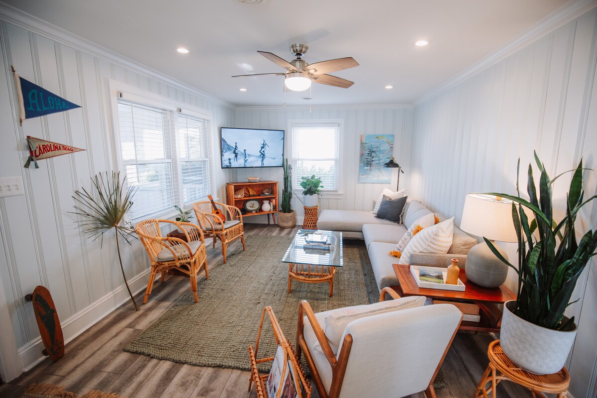 ¡The Sunrise Shack es una casa de playa tropical de los años 40 a pocos minutos de la playa, el paseo marítimo, el lago y el parque estatal! Este acogedor diseño costero y espacio creativo está convenientemente ubicado en el corazón de Carolina Beach y a solo 2 manzanas de la playa y el lago. A 5 minutos a pie del paseo marítimo hay muchos restaurantes, tiendas, alquileres, atracciones, bares, cafeterías, heladerías, donuts, una sala de juegos y mucho más. ¡Disfruta de una caminata por el parque estatal, una visita al acuario o una película de verano junto al lago!