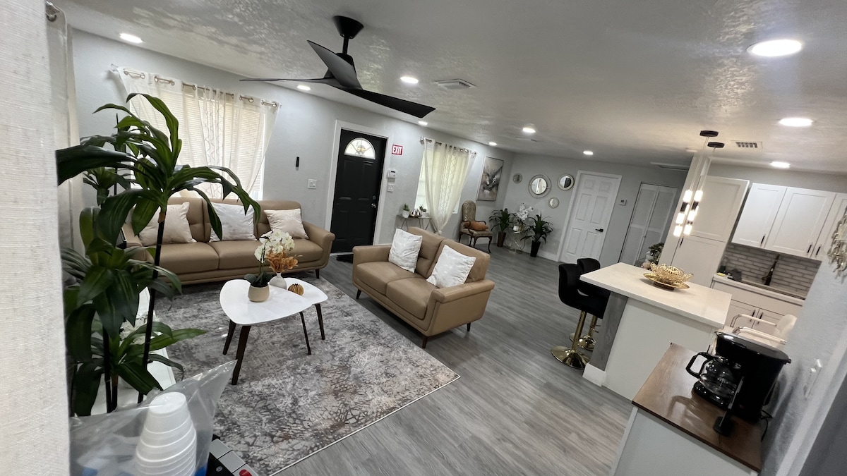 Bienvenido a nuestro moderno oasis tropical, donde la comodidad urbana se combina con servicios de resort. Esta casa puede alojar cómodamente a 9 personas, con 3 dormitorios, 2 baños, una colorida sala de juegos, una acogedora sala de estar y una cocina totalmente equipada. Salga al amplio patio trasero, completo con un campo de minigolf, jacuzzi y un encantador cenador con parrilla. Es el refugio perfecto para un entretenimiento sin fin y recuerdos inolvidables, y a solo unos pasos de numerosas atracciones de SoFlo.