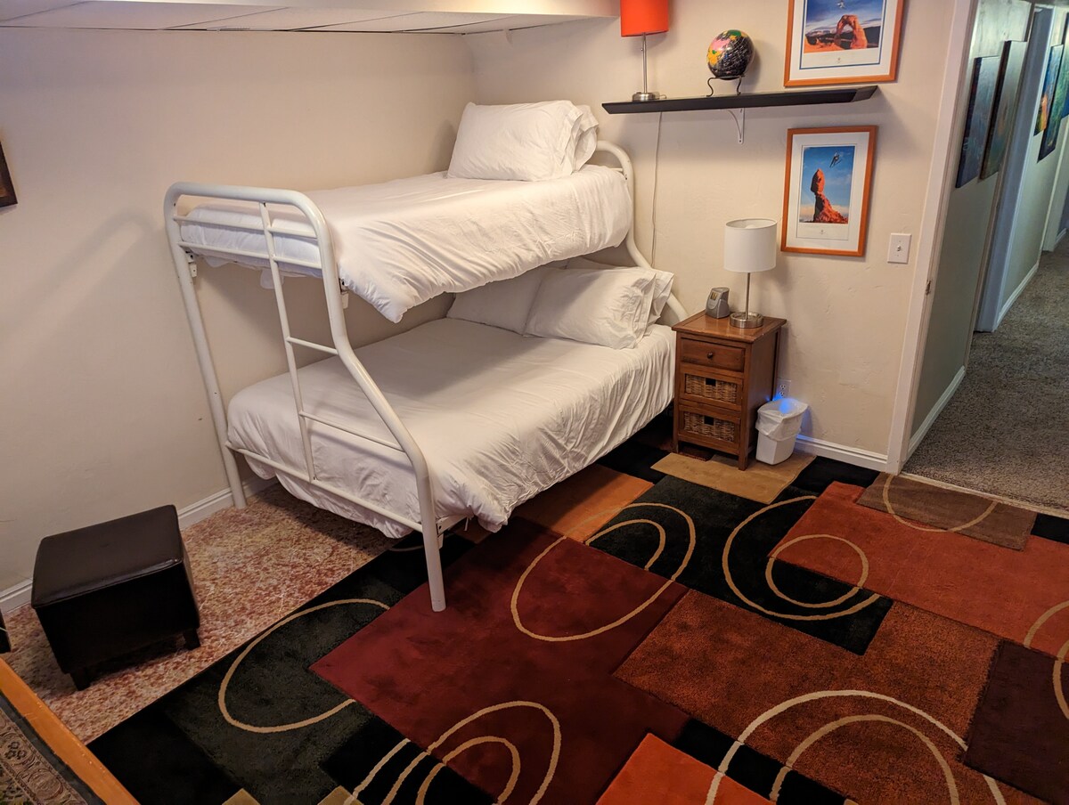 Este espacio que admite mascotas es perfecto para una escapada de fin de semana o una estancia larga. Nuestro luminoso y abierto apartamento en el sótano tiene una entrada independiente, una cocina/comedor completa, 3 dormitorios, 1 baño, chimenea, lavadora/secadora, además de una sala de juegos perfecta para niños y adultos juguetones. Nuestra casa está a 15 minutos en Lyft o Uber del aeropuerto. También puedes coger el tren de la línea verde de UTA desde el aeropuerto y llegar en 5 minutos en autobús a nuestro barrio. El acceso a la autopista cercana ofrece un viaje rápido a SLC.