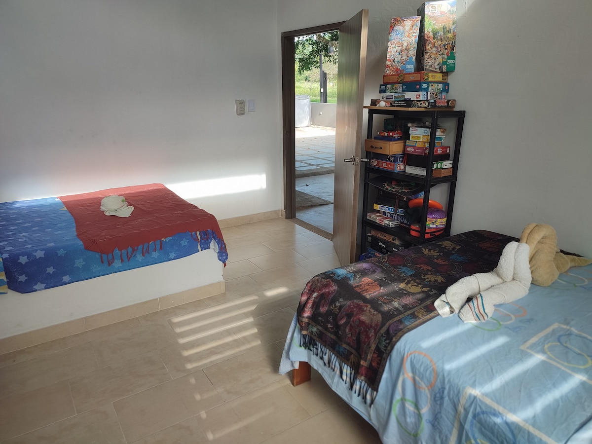 ¿Buscas un lugar para descansar y recargarte? Esta casa es el lugar ideal. Queda a 5 minutos de Mariquita, lejos del caos cotidiano, rodeado de naturaleza. La casa es petfriendly, las ventanas tienen malla para que tu peludo esté seguro y también para que los mosquitos no entren. 3 habitaciones con camas, 2 baños (uno con tina), sala principal y secundaria, armario central, WiFi, cocina y menaje, BBQ con fogón y horno de leña, piscina, jacuzzi y garaje para 3 carros.