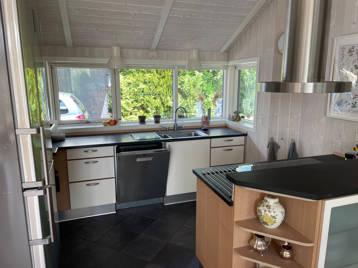 Hermosa cocina / sala de estar con luz fantástica, tanto por las ventanas de tragaluz como por la gran ventana que da a la terraza y al jardín. La cocina tiene una isla, estufa de leña y está en conexión abierta con el comedor, que a su vez está parcialmente abierto a la sala de estar. 2 habitaciones con altillo grande, baño grande con spa y ducha, así como lavandería con instalaciones de lavado. Hay 1000 m hasta la playa más cercana y 2 km hasta las tiendas más cercanas.