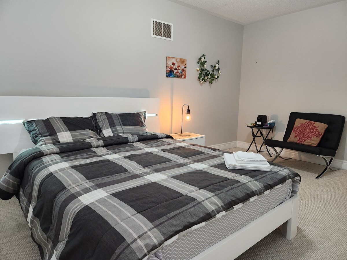 ¡Bienvenido a nuestro acogedor apartamento en el sótano! Este moderno Airbnb se encuentra en un barrio residencial tranquilo a 40 minutos en coche del centro de Toronto y a una hora de las cataratas del Niágara. El espacio bien iluminado cuenta con una cómoda cama tamaño queen, amplio espacio de almacenamiento en el espacioso armario y un interior bellamente diseñado con luz natural que inunda a través de grandes ventanales. Nota: Tenemos 2 colchones plegables individuales disponibles para colocar en el suelo del salón. Se proporcionan sábanas y almohadas adicionales.