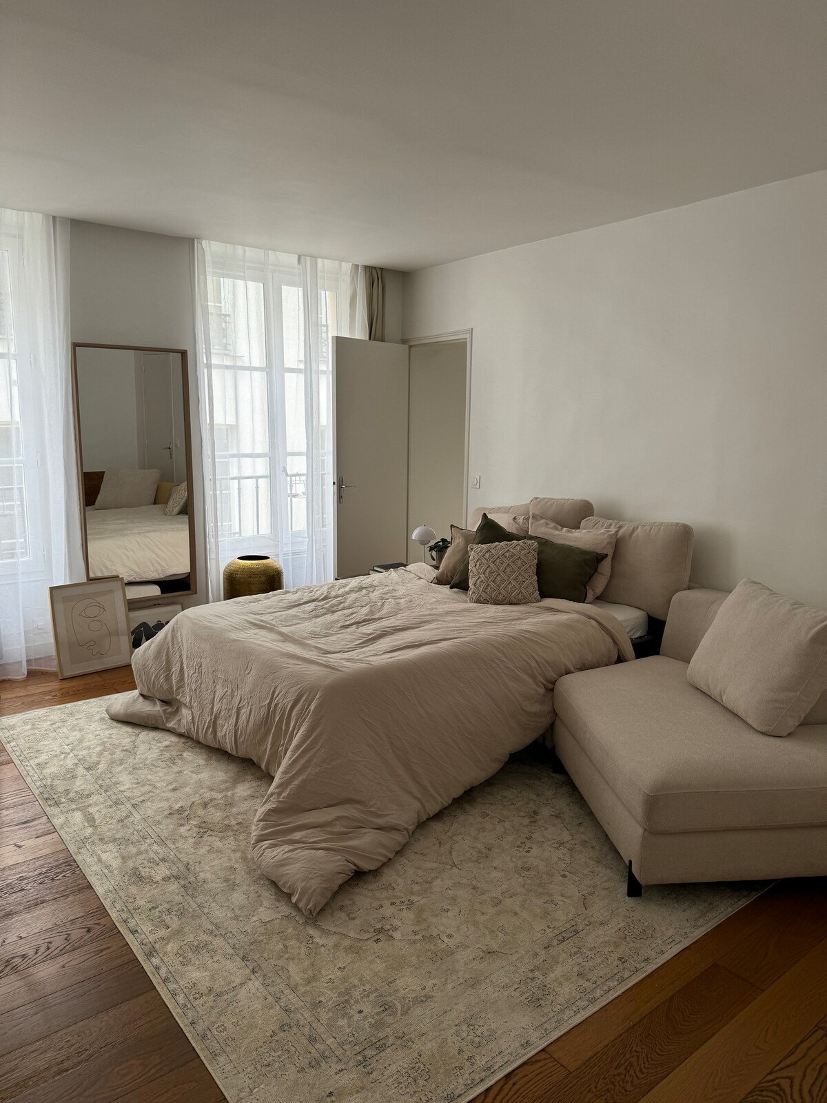 Located in the heart of the Marais, spacious apartment with beams and wooden floors, high ceilings (80m2), central air conditioning and a softening and filtering water system. Large living room with an open kitchen, 2 large bedrooms with king size beds, a bathroom with a shower and a bathtub. High speed Wifi, large flat TV with Netflix, Amazon Video, Disney+. Luxury Linen, towels, L:A Bruket amenities Organic, Animal Free Testing, Vegan.