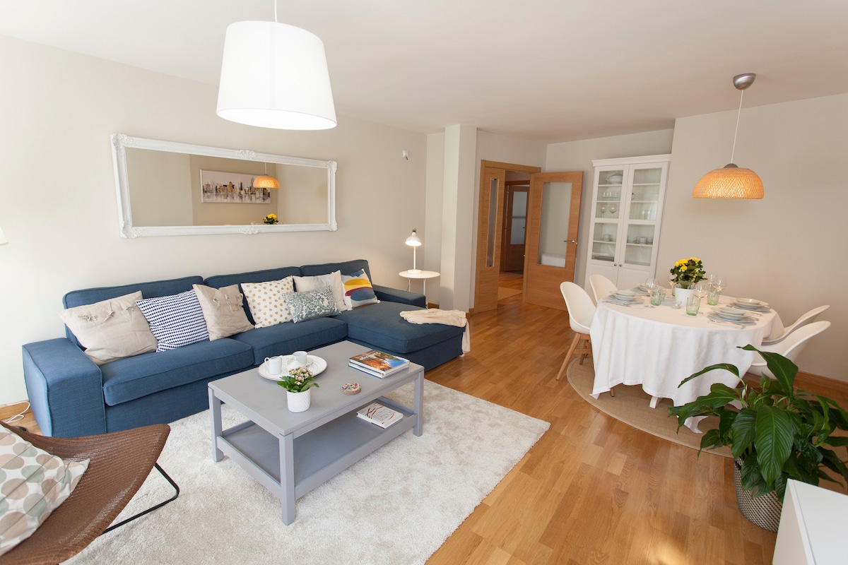 Piso renovado, amplio y luminoso. Dispone de 3 habitaciones con armarios y escritorios, dos habitaciones de matrimonio y la otra habitación con dos camas individuales. Un cuarto de baño completo con bañera, toallas y secador de pelo. Cocina totalmente equipada y con terraza. Gran salón comedor con terraza. Tercera planta con ascensor. No dispone de conexión a internet. Nº de Inscripción en Turismo VuT.09/19